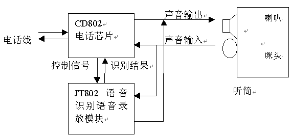 本方案主要由電話機(jī)芯片CD802加語音識(shí)別錄放模塊JT802構(gòu)成。