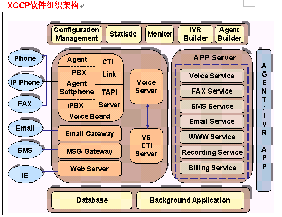 XCCP中自動(dòng)語(yǔ)音菜單是由VoiceXML語(yǔ)言組成的,這些VoiceXML頁(yè)面產(chǎn)生和存放都是在應(yīng)用服務(wù)器上進(jìn)行的;應(yīng)用服務(wù)器還存放應(yīng)用邏輯組件或中間件,進(jìn)行事務(wù)處理,IVR和座席子系統(tǒng)的業(yè)務(wù)處理都是通過這些事務(wù)處理來實(shí)現(xiàn)的;同后臺(tái)業(yè)務(wù)系統(tǒng)和數(shù)據(jù)庫(kù)通信,也是通過該模塊進(jìn)行的。