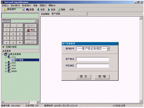 ·語音數(shù)據(jù)同步:當電話轉(zhuǎn)到該座席上時,業(yè)務(wù)界面中將根據(jù)用戶的電話號碼以及操作信息,提示座席客戶資料