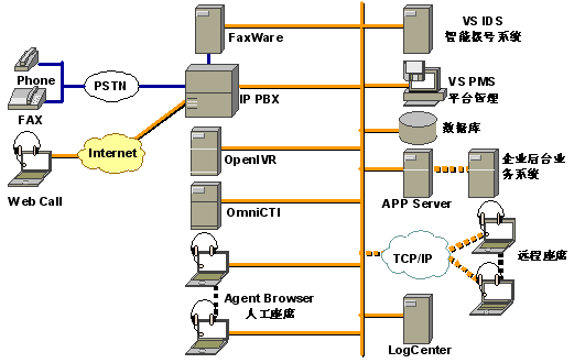 根據(jù)上述幾點,上海聲軟網絡技術有限公司(www.voicesoft.cn)的CommSuites for IPCC系統(tǒng)就是就是專門為中小企業(yè)量身定制的的IP呼叫平臺,CommSuites采用3COM的IP交換機NBX交換機為通信接入子系統(tǒng),結合CommSuites的CTI中間件,組成功能完善的IP呼叫中心平臺,下面是CommSuites for IPCC系統(tǒng)結構圖: