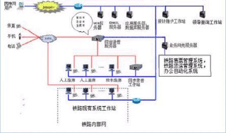 客戶利用電話、傳真、電子郵件、因特網(wǎng)、手機(jī)、網(wǎng)絡(luò)電話等撥打某統(tǒng)一特服號碼(如100xxxx)進(jìn)入鐵路客戶服務(wù)中心系統(tǒng),本系統(tǒng)依托鐵路各類業(yè)務(wù)技術(shù)支持系統(tǒng)和網(wǎng)絡(luò)系統(tǒng),通過人工受理或自動(dòng)語音服務(wù)等方式全天24小時(shí)不間斷地為旅客、貨主提供各種鐵路服務(wù);形成了對外服務(wù)于客戶,對內(nèi)管理、分析、決策系統(tǒng)相結(jié)合的新型客戶服務(wù)中心。
