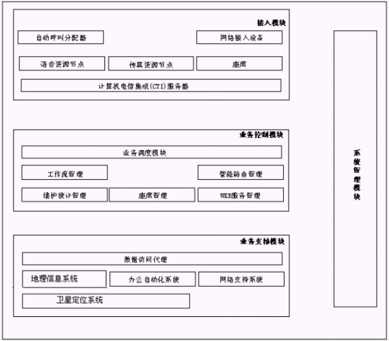 博宇110自動報(bào)警與指揮調(diào)度系統(tǒng)的邏輯結(jié)構(gòu)由以下四大模塊構(gòu)成:接入模塊、業(yè)務(wù)控制模塊、業(yè)務(wù)支撐模塊、系統(tǒng)管理模塊,如下圖所示。其中,接入模塊、業(yè)務(wù)控制模塊和業(yè)務(wù)支撐模塊構(gòu)成了整個(gè)系統(tǒng)軟件體系結(jié)構(gòu)的三個(gè)層次,而系統(tǒng)管理模塊則橫貫始終。