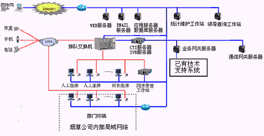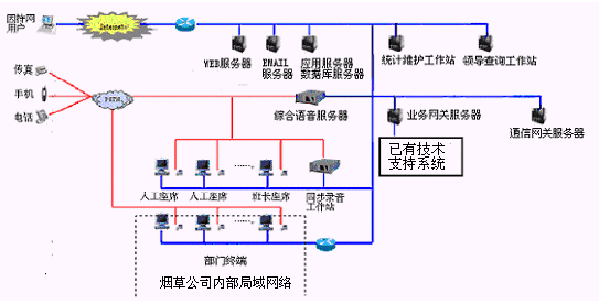 卷煙經(jīng)銷戶等客戶利用電話、傳真、電子郵件、因特網(wǎng)、手機(jī)、短消息等撥打統(tǒng)一的特服號(hào)碼(如800XXX或9XXXX)進(jìn)入煙草公司呼叫中心,本系統(tǒng)依托煙草公司各類業(yè)務(wù)技術(shù)支持系統(tǒng)和網(wǎng)絡(luò)系統(tǒng),實(shí)現(xiàn)煙草專賣局原有管理系統(tǒng)/業(yè)務(wù)系統(tǒng)及數(shù)據(jù)庫(kù)的無縫連接,通過人工受理或自動(dòng)語(yǔ)音服務(wù)等方式全天24小時(shí)不間斷地為客戶提供各種服務(wù)。