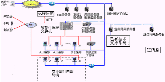 客戶利用電話、傳真、手機等撥打統(tǒng)一的特服號碼(如800XXX或9XXXX)或因特網進入農業(yè)分布式呼叫中心,本系統(tǒng)依托農業(yè)部門各類計算機業(yè)務技術支持系統(tǒng)和網絡系統(tǒng),實現與農業(yè)部門原有管理系統(tǒng)/業(yè)務系統(tǒng)及數據庫的無縫連接,通過人工受理或自動語音服務等方式全天24小時不間斷地為客戶提供各種服務。