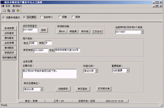 客戶打入電話后,當(dāng)系統(tǒng)的自動語音應(yīng)答子系統(tǒng)無法解決納稅人問題時,客戶可選擇人工服務(wù),由客戶服務(wù)代表直接接聽納稅人電話,處理并解決納稅人問題。此時納稅人同座席話務(wù)人員直接溝通,并同時記錄下該客戶的聯(lián)系方式,將相關(guān)數(shù)據(jù)添加入系統(tǒng)數(shù)據(jù)庫;也可以在數(shù)據(jù)庫的支持下回答國家和地方的稅收政策及相關(guān)規(guī)定等的咨詢和疑問。客戶也可以選擇自動語音服務(wù)方式,根據(jù)系統(tǒng)的語音提示輸入按鍵,選擇類別,將自己的投訴和建議以及自己的聯(lián)系方式信息以留言錄音的方式保存在系統(tǒng)中。系統(tǒng)同時還支持自動傳真方式,客戶可以通過傳真機進入本系統(tǒng),通過按鍵選擇傳真方式,將自己的意見建議等的文本內(nèi)容傳真給系統(tǒng),系統(tǒng)自動接受并存入數(shù)據(jù)庫。