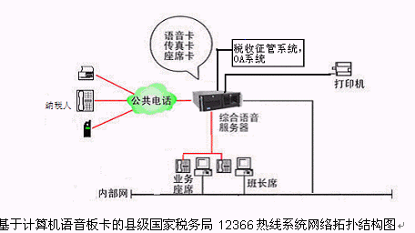 本系統(tǒng)提供基于計算機語音板卡和交換機兩種語音接入方式,都支持1號和7號信令線路的接入。對于省級-地市級的稅務(wù)局12366多媒體納稅服務(wù)熱線系統(tǒng),可選用交換機作為語音接入設(shè)備,保障系統(tǒng)的可靠性和穩(wěn)定性;對于20個以下座席的縣級國家稅務(wù)局12366多媒體納稅服務(wù)熱線系統(tǒng),則建議使用基于計算機語音板卡的形式,可以減少企業(yè)投資。