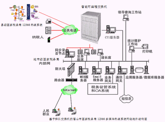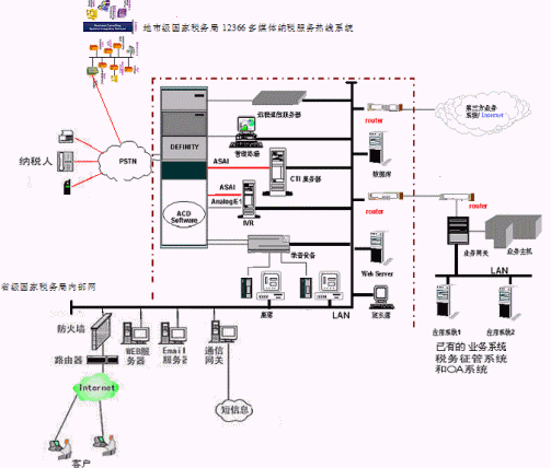 系統(tǒng)支持省-市-縣國家稅務(wù)局12366多媒體熱線系統(tǒng)的語音和數(shù)據(jù)聯(lián)網(wǎng); 提供完善的組網(wǎng)方案,實現(xiàn)資源共享,統(tǒng)一提供服務(wù)。