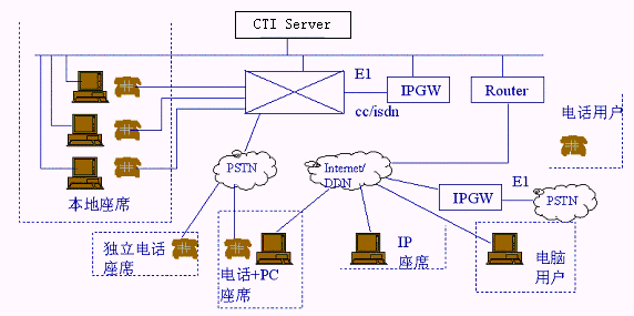 本系統(tǒng)物理結(jié)構(gòu)由帶語音板卡的工控機或排隊交換機、座席分流器、CTI服務(wù)器、IVR(交互式語音應(yīng)答)/IFR(交互式傳真應(yīng)答)服務(wù)器、業(yè)務(wù)代表座席、班長座席、統(tǒng)計維護管理工作站、因特網(wǎng)(WEB)服務(wù)器、電子郵件(EMAIL)服務(wù)器、數(shù)據(jù)庫/應(yīng)用服務(wù)器、業(yè)務(wù)網(wǎng)關(guān)服務(wù)器、錄音留言工作站、領(lǐng)導(dǎo)查詢工作站、網(wǎng)絡(luò)系統(tǒng)等構(gòu)成。