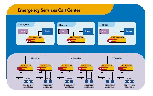 在阿拉貢地區(qū)撥打112可以接通Zaragoza、Huesca或Teruel三地的最近的呼叫中心。在接線員點(diǎn)擊電子地圖上呼叫方所在位置后,呼叫便通過MAXcess設(shè)備自動(dòng)路由到離呼叫方最近的分支機(jī)構(gòu)的專用電話上。接下來,該分支機(jī)構(gòu)便立即派出緊急救護(hù)車。接線員輸入到系統(tǒng)中的有關(guān)事件的信息也可以通過LAN立即到達(dá)遠(yuǎn)端MAXcess。