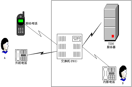 如圖1所示,在一個典型的應(yīng)用環(huán)境里,TIDS系統(tǒng)可與公司或單位的電話交換機(jī)通過一條或若干條模擬電話線相連。未來TIDS的版本將可支持E1/T1數(shù)字中繼線?梢詫IDS設(shè)置為缺省的電腦話務(wù)員,即用戶呼叫直接由TIDS系統(tǒng)處理;也可以分配一個分機(jī)號碼給TIDS,當(dāng)用戶需要時可撥該號碼使用TIDS服務(wù)。在后一種情況下,最好是在交換系統(tǒng)的問候語中提示用戶如何撥打TIDS系統(tǒng)。