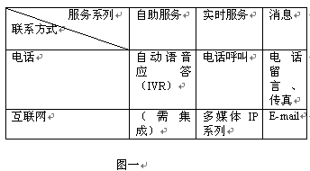 "客服寶"是一套可靠性和安全性達到電信級要求標(biāo)準的多媒體接入方式的網(wǎng)絡(luò)呼叫中心平臺,支持電話、Internet、消息、有線和無線的多渠道的客戶聯(lián)系,具有高容量、高實用性、高擴展性的特點。它在一個統(tǒng)一的平臺上整合所有的客戶聯(lián)系,能實現(xiàn)傳統(tǒng)電話、傳真、電話留言、E-mail、Chat、網(wǎng)絡(luò)電話、視頻、網(wǎng)頁互動、白板、文件傳輸和程序共享等,它所提供的服務(wù)系列如圖一所示。在系統(tǒng)的結(jié)構(gòu)上,"客服寶"支持在一個可管理的IP網(wǎng)絡(luò)中設(shè)置遠程座席和多地點分布,實現(xiàn)分布座席,集中管理。