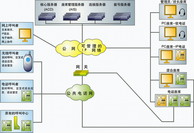 處理的呼叫類型包括:電話呼入、電話呼出(座席的軟電話)、回呼、消息(e-mail、語音留言、傳真)、鍵盤聊天、網(wǎng)上協(xié)作、共同瀏覽、網(wǎng)上語音和視頻。