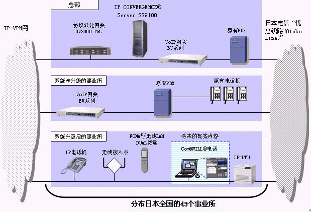 CONVERGENCE® Server SS9100(以下簡(jiǎn)稱SS9100)"為基礎(chǔ)的IP Centrex系統(tǒng)(注1)。預(yù)計(jì)在2007年構(gòu)筑完成連接其分布日本全國(guó)各地的43個(gè)事業(yè)所的企業(yè)內(nèi)部IP