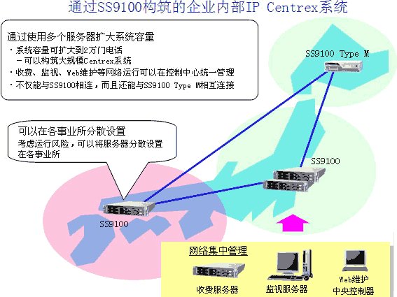 多個(gè)SS9100服務(wù)器相互協(xié)作,擴(kuò)大了系統(tǒng)整體容量。以往模型由1個(gè)服務(wù)器構(gòu)成,系統(tǒng)最大只能容納5千門電話,而SS9100 R5可以構(gòu)筑將系統(tǒng)整體容量擴(kuò)展到容納2萬(wàn)門電話的大規(guī)模Centrex系統(tǒng)。進(jìn)而,通過(guò)將服務(wù)器分散設(shè)置在各事業(yè)所的形式,可以考慮分散各事業(yè)所之間故障危險(xiǎn)的基礎(chǔ)上構(gòu)筑系統(tǒng)。
