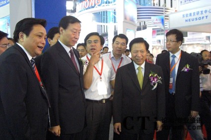 圖為省委書記梁保華(右二)、省長羅志軍(左二)、省外經(jīng)貿(mào)廳副廳長趙進(jìn)(右一)在常州副市長韓九云(左一)等的陪同下視察沖電氣軟件技術(shù)(江蘇)有限公司展臺(tái)