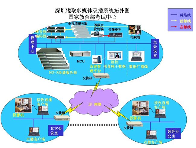 國家教育部考試中心為了對高考等大型考試實(shí)時(shí)性指導(dǎo)、監(jiān)考、培訓(xùn)等,特建立了視頻會議系統(tǒng)、監(jiān)考系統(tǒng)。為了使整個(gè)系統(tǒng)更完善、應(yīng)用價(jià)值更高,因此在此基礎(chǔ)上配置了銳取多媒體錄播系統(tǒng)。不僅實(shí)現(xiàn)了與各地考試中心及考點(diǎn)的圖像、語音和數(shù)據(jù)的交互通訊,還可以輔助系統(tǒng)完成視頻會議、監(jiān)考系統(tǒng)及培訓(xùn)的錄制、直播和點(diǎn)播功能,錄制、直播和點(diǎn)播的內(nèi)容包括了所有考試中心、考點(diǎn)圖像以及聲音和數(shù)據(jù)信號。