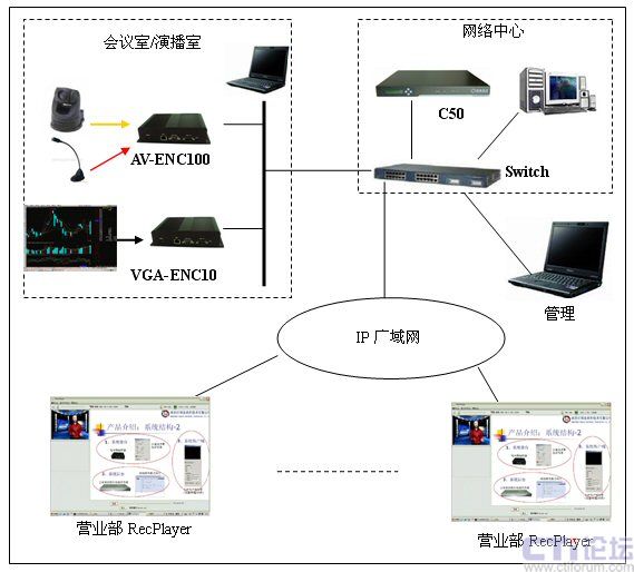在分析了海通證券的實際需求和網(wǎng)絡環(huán)境以后,決定采用一套DSS-R-C50+來組建整個媒體廣播系統(tǒng)。系統(tǒng)由媒體采集系統(tǒng)AV-ENC100/VGA-ENC100,流媒體處理和錄制系統(tǒng)C50和媒體接收系統(tǒng)RecPlayer組成。通過此系統(tǒng)可以實現(xiàn)語音、視頻和計算機桌面的同步實時直播、錄制和點播。系統(tǒng)的結(jié)構(gòu)圖如下:
