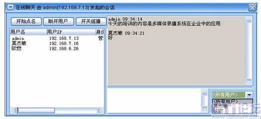 系統(tǒng)增加了多方文字互動聊天功能,在線聊天功能可以選擇給所有人員發(fā)送消息,也可以選擇給某一特定人員發(fā)送。這樣在會議或培訓的過程中,管理員可以選擇性的提出相應的問題給相關(guān)人員,考核相關(guān)人員的培訓效果;其他人員也可以將會議或培訓過程中遇到的疑問、難點及時的反應給管理員進行解答,增強會議的成效。