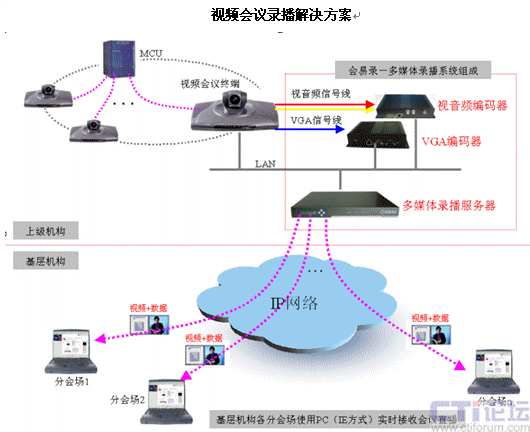 如圖所示,上級機構(gòu)視音頻編碼器接在視音頻源上,對視音頻信號采集,VGA編碼器采集VGA信號,通過網(wǎng)絡(luò)傳給放在機房的多媒體錄播服務(wù)器;鶎訖C構(gòu)的各個分會場通過IE瀏覽器的方式接受會議直播。
