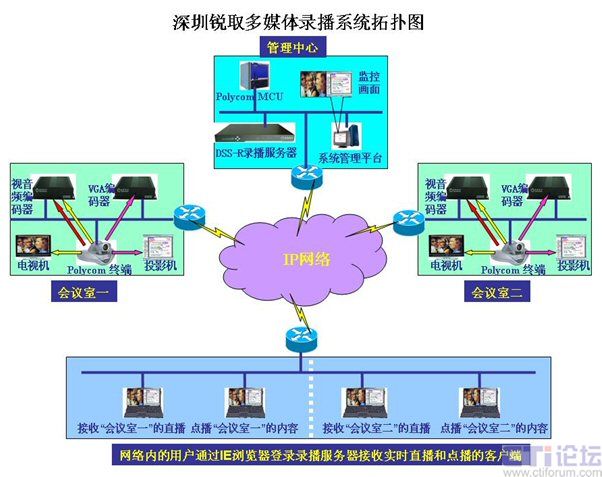 錄播服務器放置在管理中心,視音頻編碼器(采集聲音、圖像)放置在會議室,VGA編碼器(采集VGA信號)放置在會議室,客戶端分別為網絡內的任意一臺計算機。整個系統(tǒng)簡單明了,分布靈活,無需專業(yè)布線即可完成安裝。各部分功能如下:
