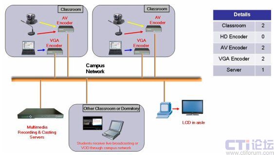 如上圖所示,服務(wù)器型號為DSS-R-T2,T系列的產(chǎn)品是銳取公司專門應(yīng)用于教育行業(yè)的產(chǎn)品。T2可支持兩個教室的同時錄制與直播,放置在學(xué)校數(shù)據(jù)中心的機(jī)房中。兩個AV Encoder和兩個VGA Encoder分別放置在需要做錄制直播的教室中。學(xué)生通過校園網(wǎng)或者Internet連接到服務(wù)器即可收看多媒體教學(xué)的直播,包括老師的圖像聲音以及講解的課件內(nèi)容。在教學(xué)樓中,每一層的走廊里都安裝了大的LCD顯示屏,服務(wù)器上的多媒體內(nèi)容也將同時傳到這些顯示屏上。