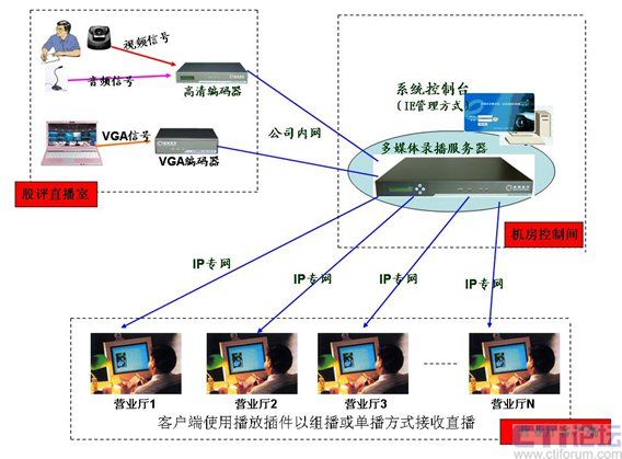 如上圖所示,在多媒體股評(píng)直播室中,股評(píng)師的講解圖像和聲音以及電腦中分析數(shù)據(jù)同步傳輸采集到控制機(jī)房中,通過(guò)多媒體錄播服務(wù)器直播模塊的組播方式將信息傳達(dá)給全國(guó)遍布的營(yíng)業(yè)網(wǎng)點(diǎn),實(shí)現(xiàn)股評(píng)直播的需求。(權(quán)威股評(píng)師將在每天下午股市休市后對(duì)一天當(dāng)中股票大盤做一次全面的分析,并對(duì)本周或某行業(yè)的形式做一個(gè)全面的總結(jié),并對(duì)未來(lái)形勢(shì)做出判斷。)