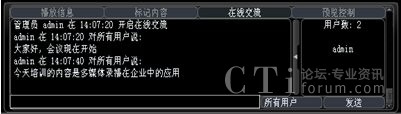 系統(tǒng)增加了多方文字互動交流功能,在線交流功能可以選擇給所有人員發(fā)送消息,也可以選擇給某一特定人員發(fā)送。這樣在會議或培訓(xùn)的過程中,管理員可以選擇性的提出相應(yīng)的問題給相關(guān)人員,考核相關(guān)人員的培訓(xùn)效果;其他人員也可以將會議或培訓(xùn)過程中遇到的疑問、難點及時的反應(yīng)給管理員進行解答,增強會議或培訓(xùn)的成效。