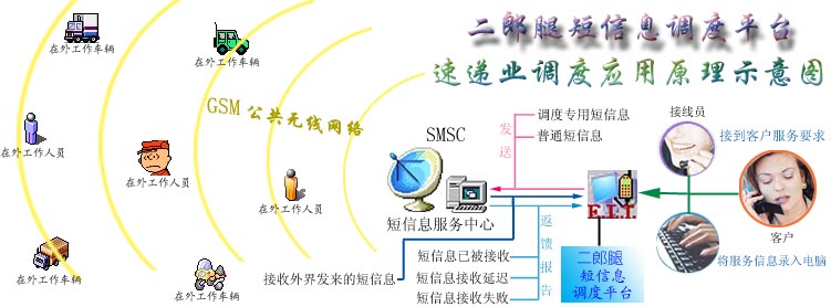二郎腿短信息調(diào)度平臺是利用目前社會上大眾普遍擁有手機(jī)的現(xiàn)成資源,通過移動通訊公司提供的短信息服務(wù)功能作為通信信道,直接對手機(jī)進(jìn)行低層操作控制,以“收發(fā)短信息”的方式來實現(xiàn)信息的傳遞(通信資費(fèi)標(biāo)準(zhǔn)與在手機(jī)上收發(fā)短信相同)。調(diào)度平臺還對每條發(fā)出的信息的接收狀態(tài)進(jìn)行跟蹤,確保信息能被安全 、準(zhǔn)確的接收!罢{(diào)度專用短信息”遵循專為各種調(diào)度工作而設(shè)計的《調(diào)度協(xié)議》,遵循該協(xié)議能最大限度避免由于“短信息服務(wù)中心”的失誤,而導(dǎo)致短信息丟失的情況。調(diào)度專用短信息對“接收設(shè)備”無特殊要求,任何支持“接收中文短信息”的手機(jī)都能實現(xiàn)。