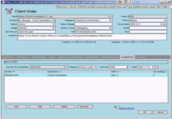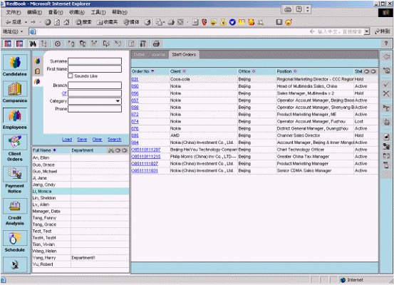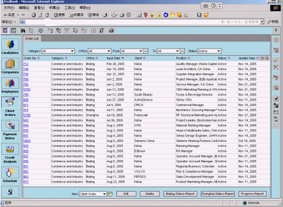 融博獵頭業(yè)務(wù)管理系統(tǒng)已經(jīng)被某著名的獵頭公司正式上線,該系統(tǒng)同時(shí)在北京、上海等五個(gè)分公司使用。根椐使用客戶反映,該系統(tǒng)功能強(qiáng)大、操作簡(jiǎn)單,基本覆蓋了獵頭業(yè)務(wù)的全部?jī)?nèi)容;各種業(yè)務(wù)流程規(guī)范、流暢;各類統(tǒng)計(jì)報(bào)表靈活、準(zhǔn)確;自動(dòng)生成簡(jiǎn)歷、客戶提交報(bào)告、催款通知、項(xiàng)目進(jìn)度報(bào)告,極大地提高了企業(yè)的工作效率。該系統(tǒng)與目前國(guó)際先進(jìn)的獵頭公司所使用的系統(tǒng)相比,處于領(lǐng)先的地位。
