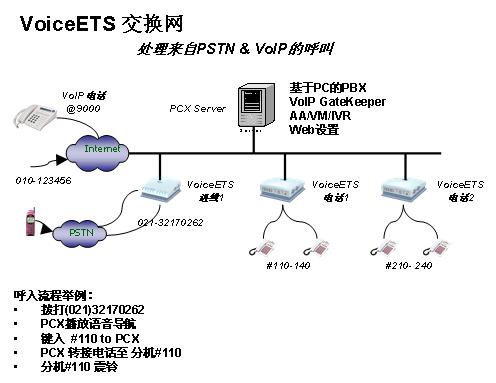 。。VoiceETS還可以做到更多,它是由網(wǎng)絡(luò)IVR(TAPI標(biāo)準(zhǔn)設(shè)備)盒、基于PC的網(wǎng)絡(luò)電話交換軟件、GateKeeper以及VOIP網(wǎng)關(guān)構(gòu)成。