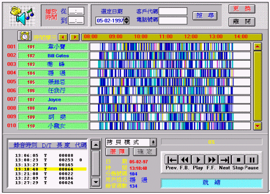 以時(shí)間為水平軸、分機(jī)號(hào)碼為垂直軸機(jī)制,錄音分布狀況一目了然。該窗口下,可經(jīng)由日期、分機(jī)之選擇、或客戶代號(hào)之輸入,輕松找到您要聽取錄音檔。您只要點(diǎn)取錄音棒的定點(diǎn),即得知錄音記錄清單,播放操作: