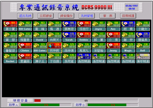 DCRS與BRS系列之全數(shù)字專業(yè)通訊簿音系統(tǒng),彩色動(dòng)畫窗口,配合鼠標(biāo)操作,使您一目了然,操作容易。您可由主窗口圖標(biāo)中,清楚知道每一回路目前錄音狀態(tài),例如呈綠色的圖標(biāo)是顯示回路是閑置狀態(tài)(沒有通話狀態(tài)),用不同顏色加上不同圖案,是最易懂、最一目了然表現(xiàn)方式。各種操作按鍵與儲(chǔ)存裝置(Storage Media)狀態(tài)也出現(xiàn)在很醒目位置上也是另一系統(tǒng)特色。下面文章對(duì)回路各種常見圖標(biāo)有進(jìn)一步說明。