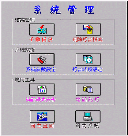 三個(gè)方塊區(qū):檔案管理區(qū)、系統(tǒng)架構(gòu)區(qū)和應(yīng)用工具區(qū)。各方塊區(qū)內(nèi)有其包含之功能指令。此外,"回主畫面"的功能鍵提供您可回到主窗口畫面的功能;"關(guān)閉系統(tǒng)"功能鍵則提供您正常操作關(guān)掉此錄音系統(tǒng)的功能。您不須依賴操作手冊(cè),也不需要?jiǎng)e人指導(dǎo),您就可以執(zhí)行一些系統(tǒng)維護(hù)設(shè)定功能。