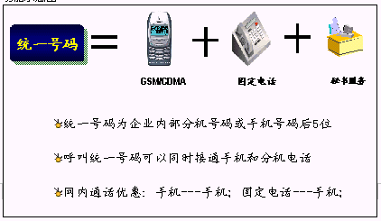 鐵路內(nèi)部員工可以統(tǒng)一所有的通信工具,只使用一個號碼,一次呼叫便可以完成通信,使通信更加簡單、可靠?梢詫崿F(xiàn)換機換網(wǎng)不換號,用戶獲得一個終身的聯(lián)系號碼,用戶無論更換任何通信工具,聯(lián)系號碼和方式不會改變。例如:在路局領(lǐng)導找下屬的時候,只需要撥打他的統(tǒng)一號碼,便可以直接找到他。不必考慮他是否在外出還是在辦公室,是否更換了手機號碼。統(tǒng)一號碼就像他員工號碼,始終不變,即撥即通!