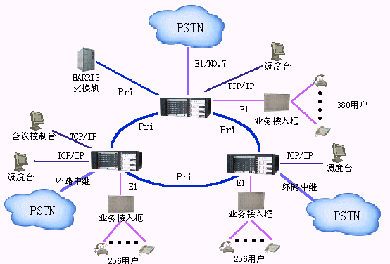 該方案適用于用戶需要建立自己的通信網(wǎng)并能實(shí)現(xiàn)行政交換、電話會(huì)議、調(diào)度交換、語(yǔ)音信箱等多種功能。這種方案解決的業(yè)務(wù)種類多,能滿足用戶的多種需要。