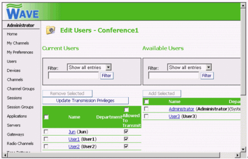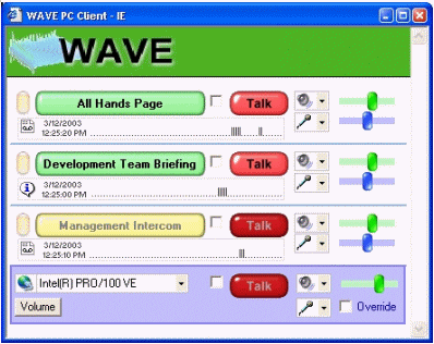WAVE的使用方式為:管理員在服務(wù)器端建立IP電話會議,參加者使用本地計算機作為客戶端,通過耳機和麥克風即可加入會議。一臺普通的奔四PC機可以支持數(shù)千個會議,每個會議也允許數(shù)百個用戶參加。管理員可以分配用戶不同的權(quán)利:如講話,主持會議等等。