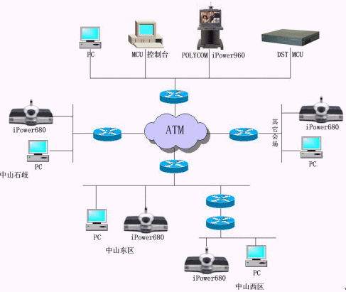 中山公安項目使用一臺DST H.323 MCS 3048/DFG的MCU、25套IPOWER600 SBRI終端和一套IPOWER900終端,目前終端使用4.01.408版本,通過的是IP OVER ATM網(wǎng)絡(luò),到每個會場的帶寬足夠---至少10M,會議召開速率為768Kbps。市局會議中心采用IPOWER900,其它25個分局會場都使用IPOWER600。