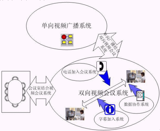為了讓系統(tǒng)成為一個真正的整體解決方案,而不是簡單的各種系統(tǒng)的堆砌,本系統(tǒng)設計的視頻會議系統(tǒng)不僅考慮每個系統(tǒng)的完整性,在設計中也著重考慮通過各自的結合,包括雙向視頻會議和單向視頻廣播之間的結合,雙向視頻會議和會議室集成的結合,再加上數(shù)據(jù)協(xié)作、電話加入功能和字幕加入功能,真正建設一個全面的多媒體結合視頻會議系統(tǒng)的應用。