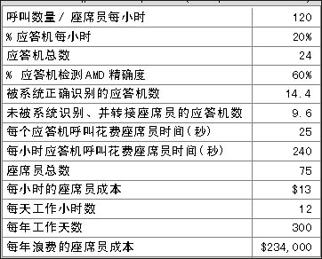 表1和表2表明在一個(gè)呼叫中心中精確的應(yīng)答機(jī)檢測(cè)(AMD)給企業(yè)所帶來(lái)的價(jià)值,兩表之間關(guān)于呼叫中心運(yùn)營(yíng)的費(fèi)用每年相差$175,500。那么不同的AMD精確度意味著什么?在上例中,精確度每增加1%意味著每年會(huì)減少約$5,850的損失。