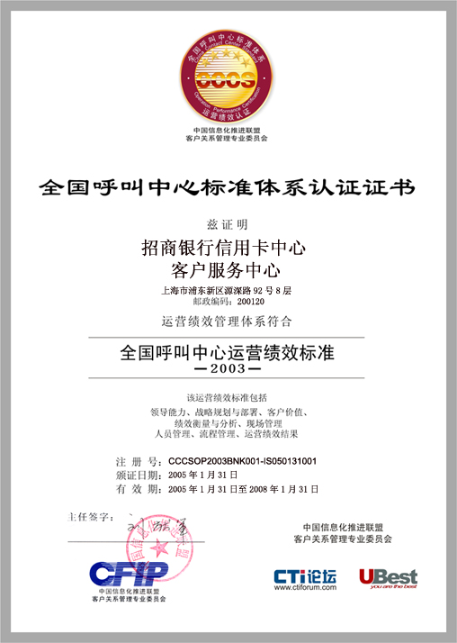 經(jīng)過長達(dá)8個(gè)月時(shí)間的準(zhǔn)備和嚴(yán)格的認(rèn)證審核,由中國信息化推進(jìn)聯(lián)盟客戶關(guān)系管理專業(yè)委員會(huì)常務(wù)副主任郭晨東先生親自掛帥組成的項(xiàng)目評(píng)審專家小組從領(lǐng)導(dǎo)能力、戰(zhàn)略規(guī)劃與部署、客戶價(jià)值、績效衡量與分析、現(xiàn)場管理、人員管理、流程管理、運(yùn)營績效結(jié)果等八個(gè)范疇對(duì)招商銀行信用卡中心客戶服務(wù)部進(jìn)行了全面而嚴(yán)格的審核,涉及五大類上百項(xiàng)詳細(xì)的運(yùn)營績效指標(biāo),歷經(jīng)初審評(píng)估、現(xiàn)場初審、初審評(píng)估報(bào)告提交與確認(rèn)、標(biāo)準(zhǔn)試運(yùn)行、績效全面提升、最終評(píng)審等階段,最終審核確認(rèn)招商銀行信用卡中心客戶服務(wù)完全符合并部分超越《全國呼叫中心運(yùn)營績效標(biāo)準(zhǔn)》(CCCS-OP-2003)的各項(xiàng)標(biāo)準(zhǔn)指標(biāo)和要求,于2005年1月31日正式批準(zhǔn)招商銀行信用卡中心通過該標(biāo)準(zhǔn)的五星級(jí)認(rèn)證,授予“五星級(jí)客戶服務(wù)中心”稱號(hào)。