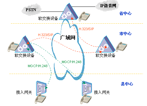 針對這種體系結(jié)構(gòu),軟交換技術(shù)就大有可為了,各地市布置軟交換設(shè)備,其間采用H.323/SIP點對點局間協(xié)議,負責(zé)各軟交換機之間的通信,在地市到縣區(qū)之間采用MGCP/H.248協(xié)議,這種協(xié)議體系充分吸取了軟交換體系控制與業(yè)務(wù)分離的思想,具有高度靈活性,可以兼容PSTN、運營商IP語音網(wǎng)、原有PBX系統(tǒng)等,并且從多方面保障話音質(zhì)量;管理上由地市軟交換設(shè)備對縣區(qū)的接入網(wǎng)關(guān)設(shè)備進行統(tǒng)一管理,號碼進行統(tǒng)一分配;同時,由地市軟交換設(shè)備提供多達數(shù)十種增值業(yè)務(wù),可以實現(xiàn)業(yè)務(wù)的統(tǒng)一升級,簡單方便。