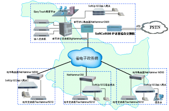 該網(wǎng)絡(luò)采用了軟交換體系結(jié)構(gòu),省廳中心采用SoftCo9500 IP語音綜合交換機,地市采用SoftUp1032網(wǎng)關(guān)設(shè)備,核心交換設(shè)備與網(wǎng)關(guān)設(shè)備之間采用MGCP協(xié)議,從而做到控制與業(yè)務(wù)分離,便于管理和業(yè)務(wù)的提供。