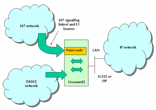 由于Aculab支持ITU-T SS7 ISUP,GroomerII通過雙信令鏈路,以信令點的形式與SS7網絡相聯(lián)。GroomerII可以配備多種不同的SS7協(xié)議軟件,每個SS7鏈路集可控制多達32個E1中繼的電路組。