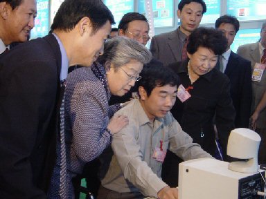 作為安徽省著名的高新技術(shù)企業(yè),科大訊飛參加了D館--政府代表團(tuán)的展出。展會(huì)現(xiàn)場(chǎng),巨型展牌樹立在安徽展區(qū)的醒目位置,獨(dú)具匠心的展區(qū)設(shè)計(jì)向每一位參觀者昭示著公司實(shí)力。展會(huì)上,科大訊飛展出了最新的電信級(jí)產(chǎn)品InterPhonic C&E 2.2、嵌入式產(chǎn)品InterSound 3.0和Talking Book電子書等。語音合成給觀眾帶來了全新的感受,流暢自然的語音合成、抑揚(yáng)頓挫的唐詩(shī)誦讀吸引了無數(shù)參觀者駐足、觀賞。國(guó)務(wù)院副總理吳儀同志參觀安徽展區(qū)時(shí),親臨訊飛展區(qū),對(duì)訊飛的語音技術(shù)表現(xiàn)出強(qiáng)烈興趣。科大訊飛陳燕總監(jiān)向吳儀副總理簡(jiǎn)要匯報(bào)了中文語音產(chǎn)業(yè)及科大訊飛公司的發(fā)展情況,并親自演示了訊飛電信級(jí)和芯片級(jí)語音產(chǎn)品。吳儀臉上不時(shí)露出微笑,鼓勵(lì)訊飛再接再厲,把民族語音產(chǎn)業(yè)做大做強(qiáng)。