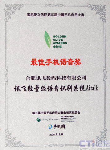 2008年6月26日,代表了中國手機(jī)應(yīng)用最高水平、最新發(fā)展的索尼愛立信杯第三屆中國手機(jī)應(yīng)用大賽金枝獎(jiǎng)?lì)C獎(jiǎng)典禮在北京隆重舉行,科大訊飛全資子公司——訊飛數(shù)碼提交的參賽產(chǎn)品,輕量級(jí)語音識(shí)別系統(tǒng)Aitalk,榮獲本屆大賽 “最佳手機(jī)語音金枝獎(jiǎng)”。這是科大訊飛既在本賽事首屆、第二屆獲此殊榮后,連續(xù)第三年奪得該獎(jiǎng)項(xiàng),充分體現(xiàn)了科大訊飛在手機(jī)語音應(yīng)用領(lǐng)域具備的超群實(shí)力和絕對(duì)的領(lǐng)先地位。
