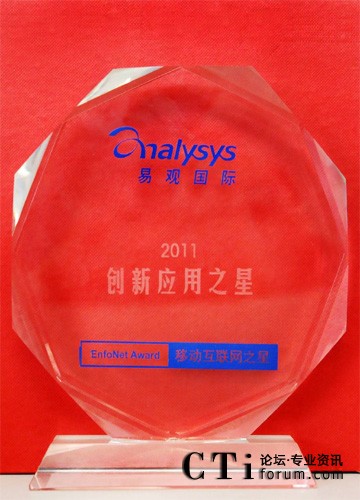 易觀國際成立于2000年,是中國信息化、互聯(lián)網(wǎng)和新媒體以及電信運(yùn)營行業(yè)規(guī)模最大的中國科技市場領(lǐng)先的研究和咨詢機(jī)構(gòu)。2011易觀“EnfoNet Award–移動互聯(lián)網(wǎng)之星”評選是易觀年度產(chǎn)業(yè)盛會——首屆移動互聯(lián)網(wǎng)博覽會暨第四屆易觀移動互聯(lián)網(wǎng)年會的重要組成部分,是易觀國際(Analysys International)為推薦中國互聯(lián)網(wǎng)及移動互聯(lián)網(wǎng)產(chǎn)業(yè)中表現(xiàn)優(yōu)異且具備發(fā)展?jié)摿Φ钠脚_及應(yīng)用而設(shè)立。