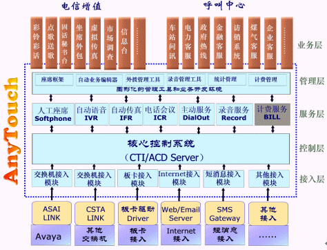 佳訊飛鴻近十年來一直致力于建設(shè)國內(nèi)一流的呼叫中心系統(tǒng)和電信增值業(yè)務(wù),其CTI方面的主打產(chǎn)品AnyTouch平臺廣泛應(yīng)用到電信、鐵路、軍隊、郵政、媒體、政府、電力、金融和商業(yè)等多個行業(yè)的呼叫中心、客服中心、CRM、電子商務(wù)和信息化平臺項目建設(shè)中。AnyTouch平臺是融合呼叫中心和電信增值業(yè)務(wù)的CTI應(yīng)用產(chǎn)品,是一個綜合的、集成的開發(fā)工具。她能夠構(gòu)建各種熱線電話系統(tǒng)、客戶服務(wù)系統(tǒng)、企業(yè)服務(wù)中心等呼叫中心業(yè)務(wù);同時可生成彩話、點歌、固話秘書臺、信息臺等電信增值業(yè)務(wù)。