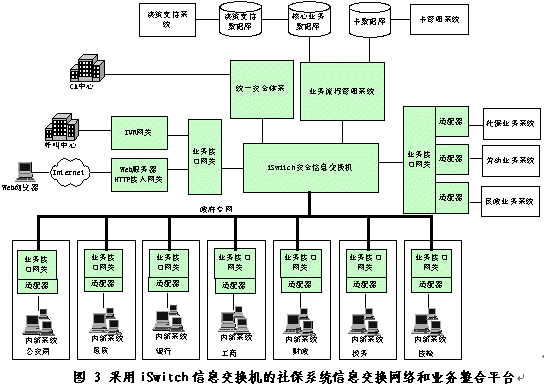 采用iSwitch安全信息交換機(jī)的社保系統(tǒng)信息交換網(wǎng)絡(luò)和業(yè)務(wù)整合平臺(tái)如圖3所示。