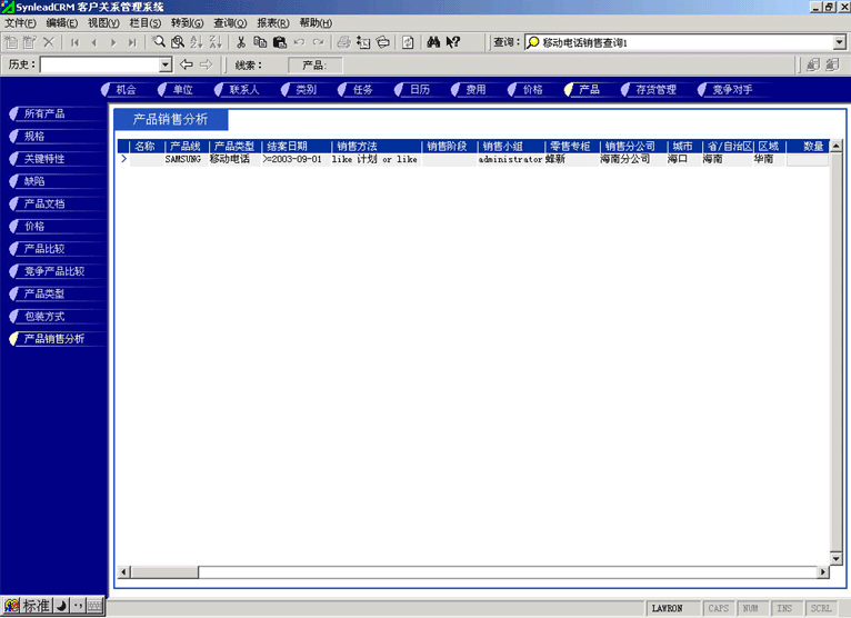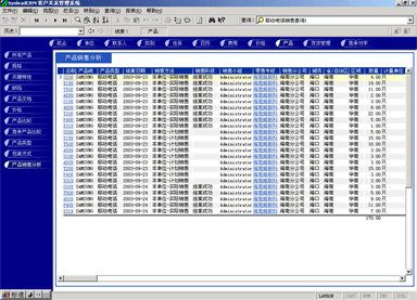 管理人員可能需要對(duì)比產(chǎn)品銷售計(jì)劃與實(shí)際銷售的產(chǎn)品數(shù)量的關(guān)系,也有可能要對(duì)比某款產(chǎn)品與競(jìng)爭(zhēng)產(chǎn)品銷售的情況,這時(shí)候可以利用產(chǎn)品銷售統(tǒng)計(jì)功能。它最大的好處是各項(xiàng)目數(shù)據(jù)普遍關(guān)聯(lián),允許任意組合查詢條件(見圖4,點(diǎn)擊下圖,可彈出更清晰的大圖)