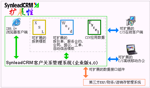 在中國CRM品牌軟件中,SynleadCRM可能是唯一的、最好的、支持"B/S+C/S雙架構"和"在線辦公+離線辦公"應用的產品,SynleadCRM企業(yè)版4.0使得用戶能夠按照最方便自己的方式擴展應用。